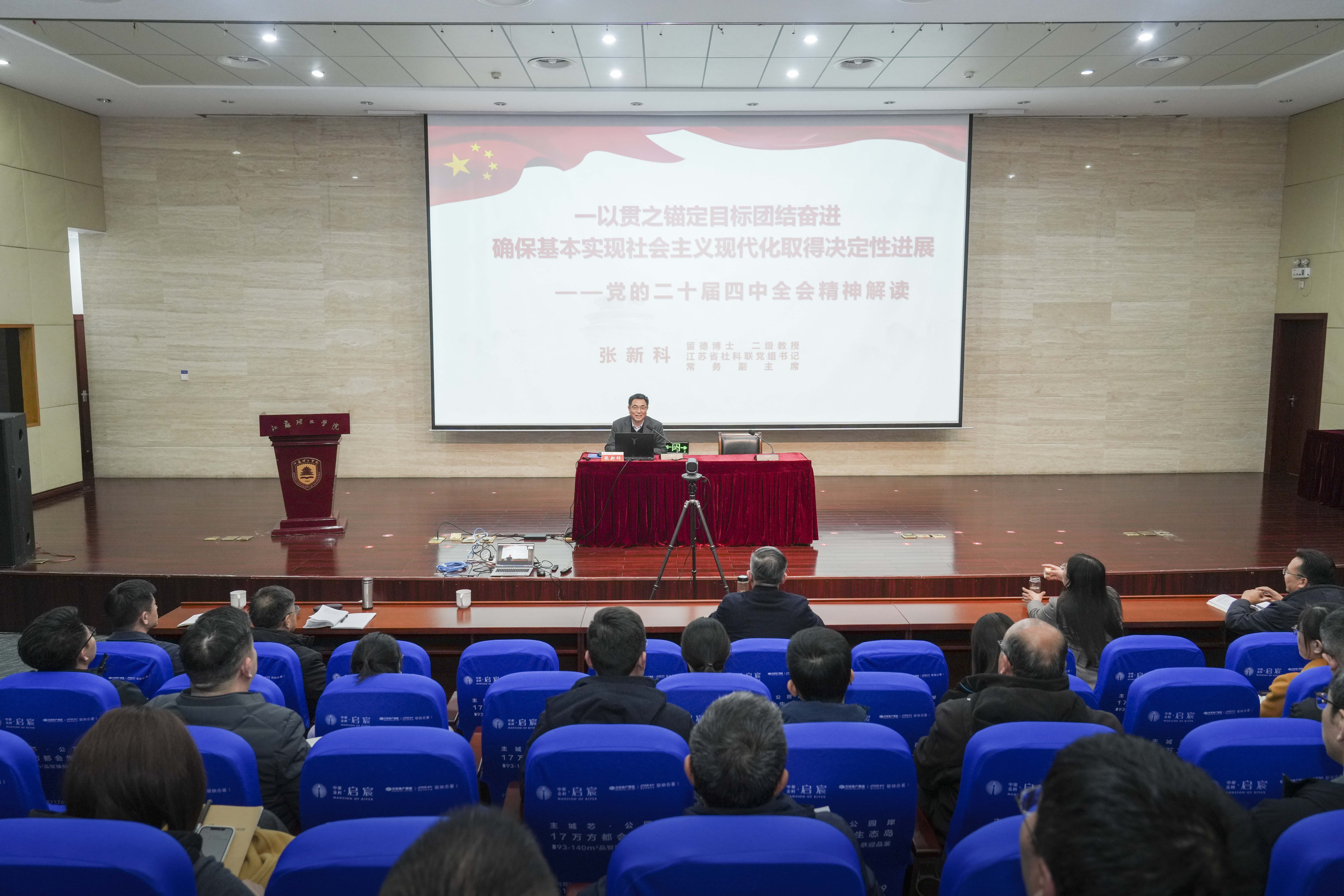 1121日下午,我校学习贯彻党的二十届四中全会精神宣讲报告会在图书馆北报告厅举行。报告会以现场宣讲+线上视频会议相结合的方式举行,我院设立分会场,全体党员师生收看辅导报告。校党委书记崔景贵主持报告会,省委宣讲团成员、江苏省社科联党组书记、常务副主席张新科作宣讲报告。